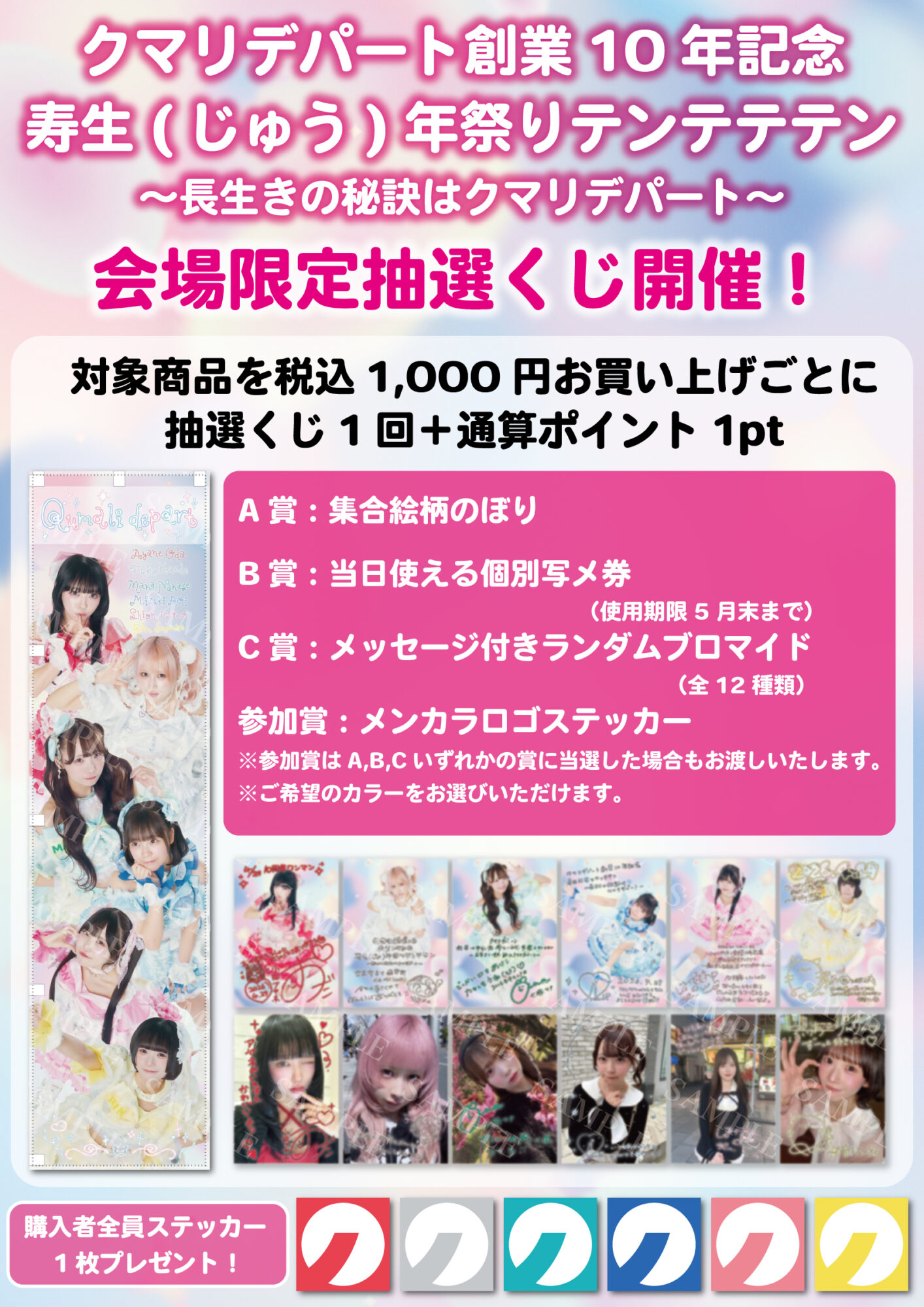 4月29日(水祝)開催 「クマリデパート創業10年記念 寿生(じゅう)年祭りテンテテテン〜長生きの秘訣はクマリデパート〜」にて、対象商品をお買い上げいただくと会場限定のぼりなどが当たる抽選くじを行います。
